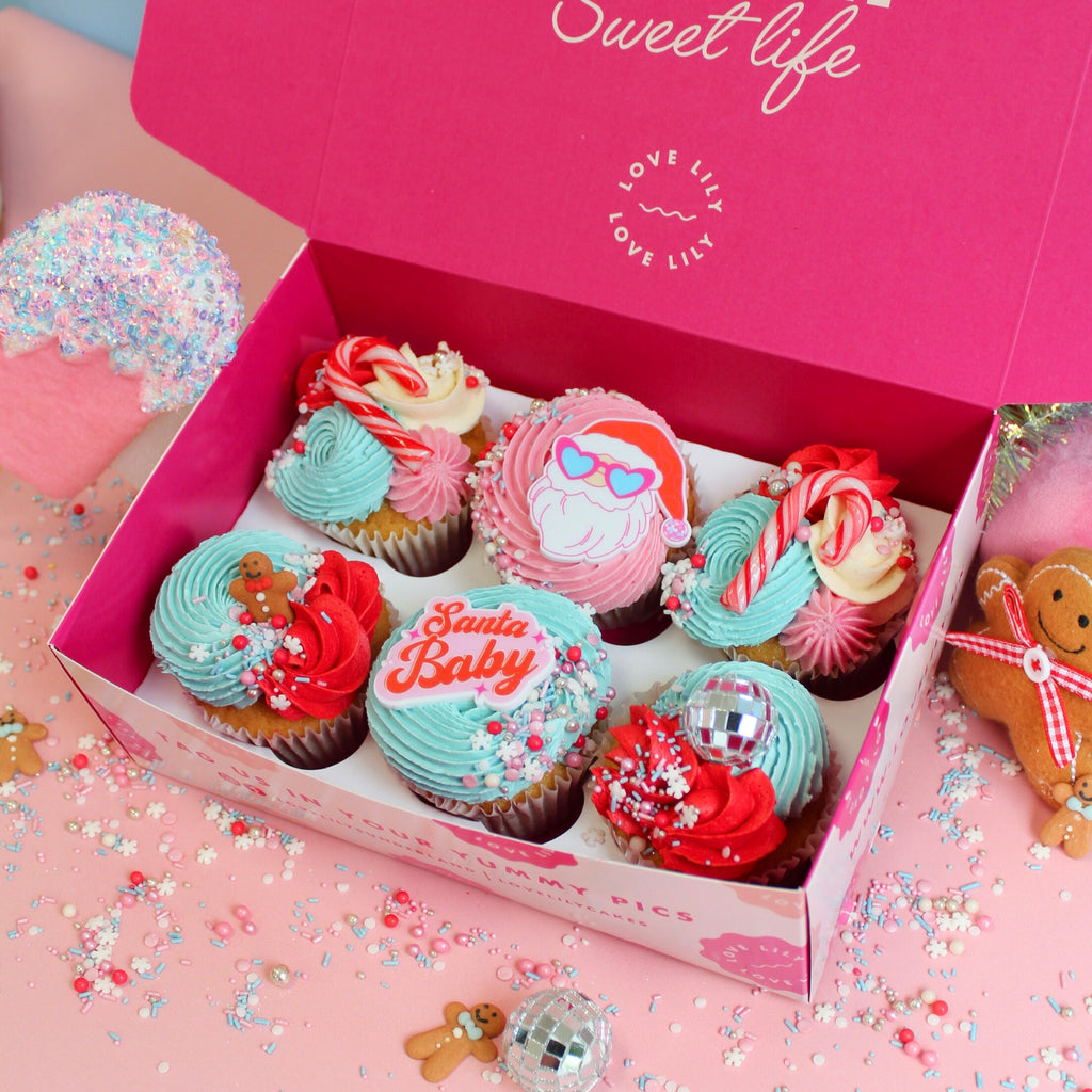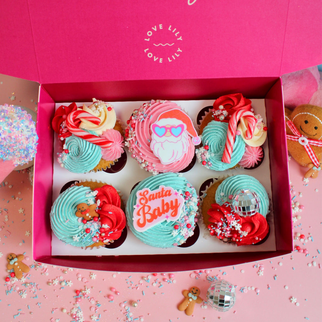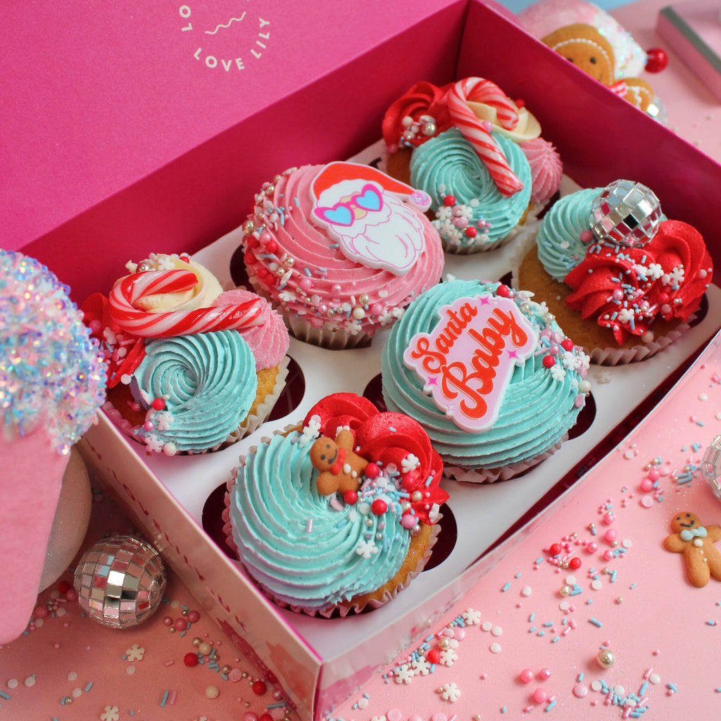 A box of 6 cupcakes, topped with Christmas magic:
